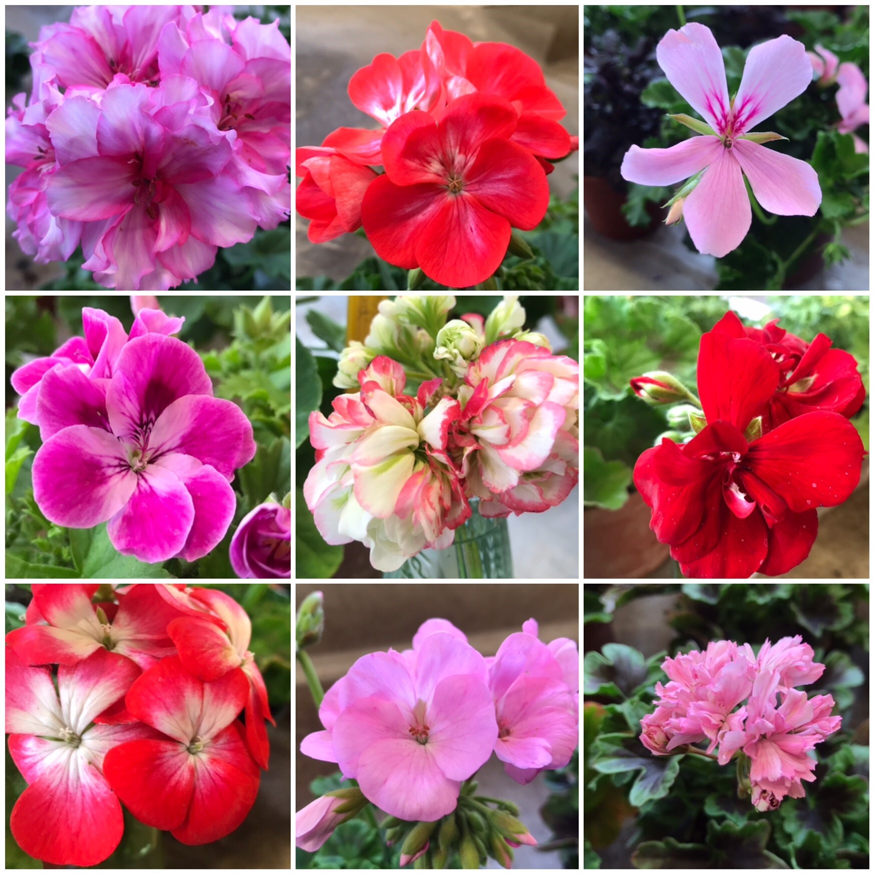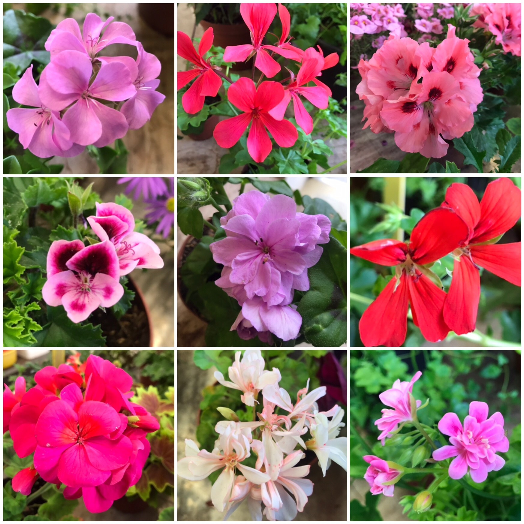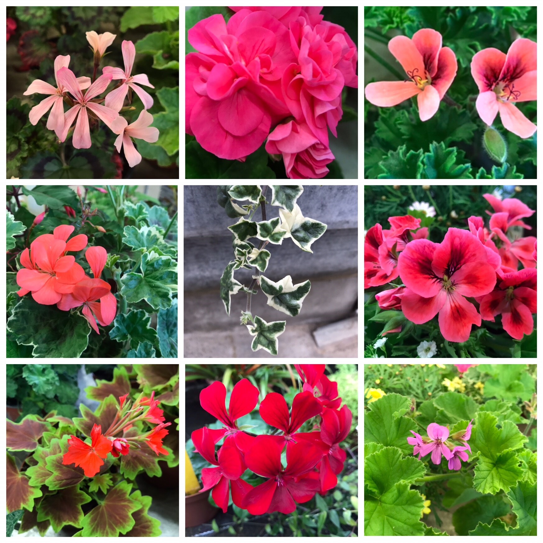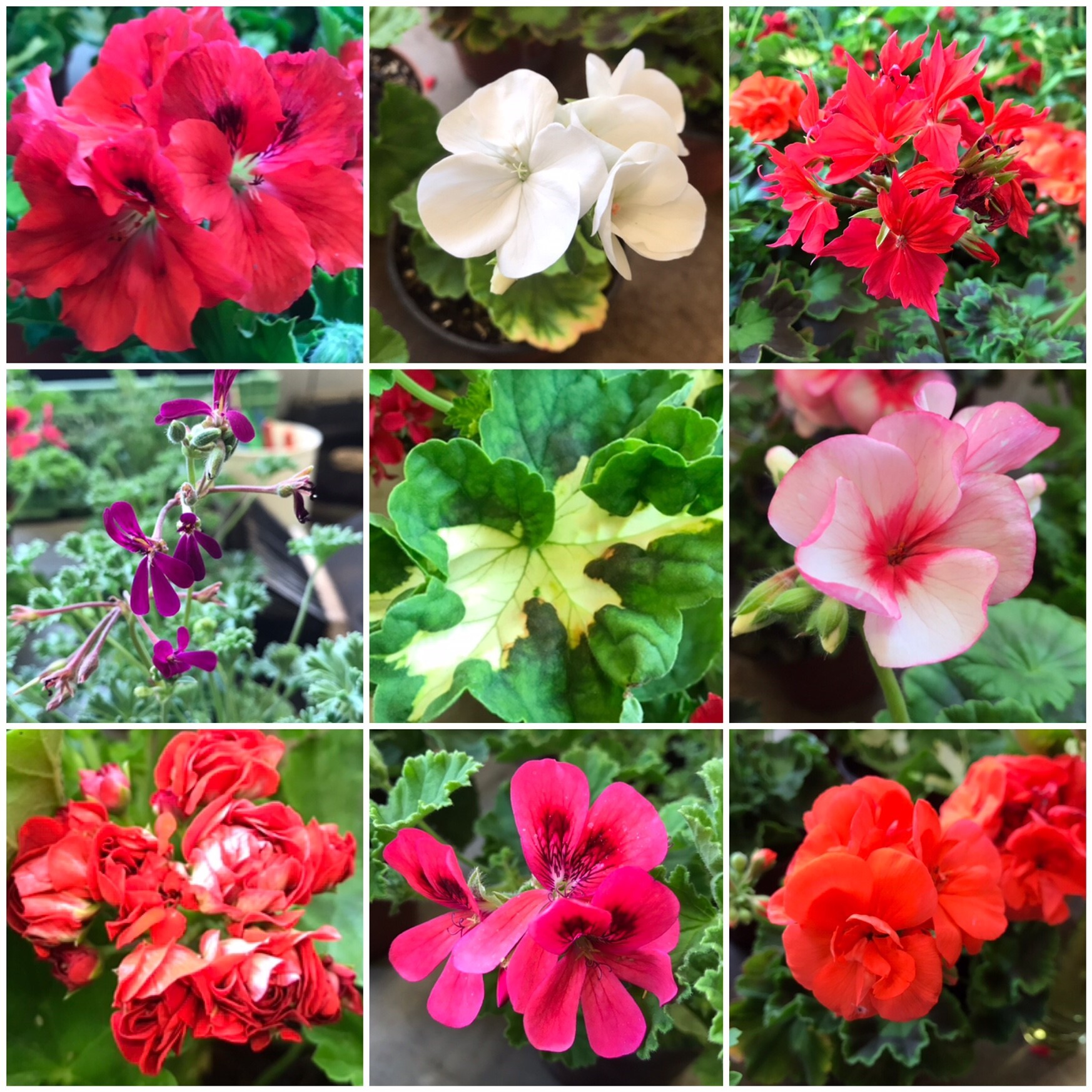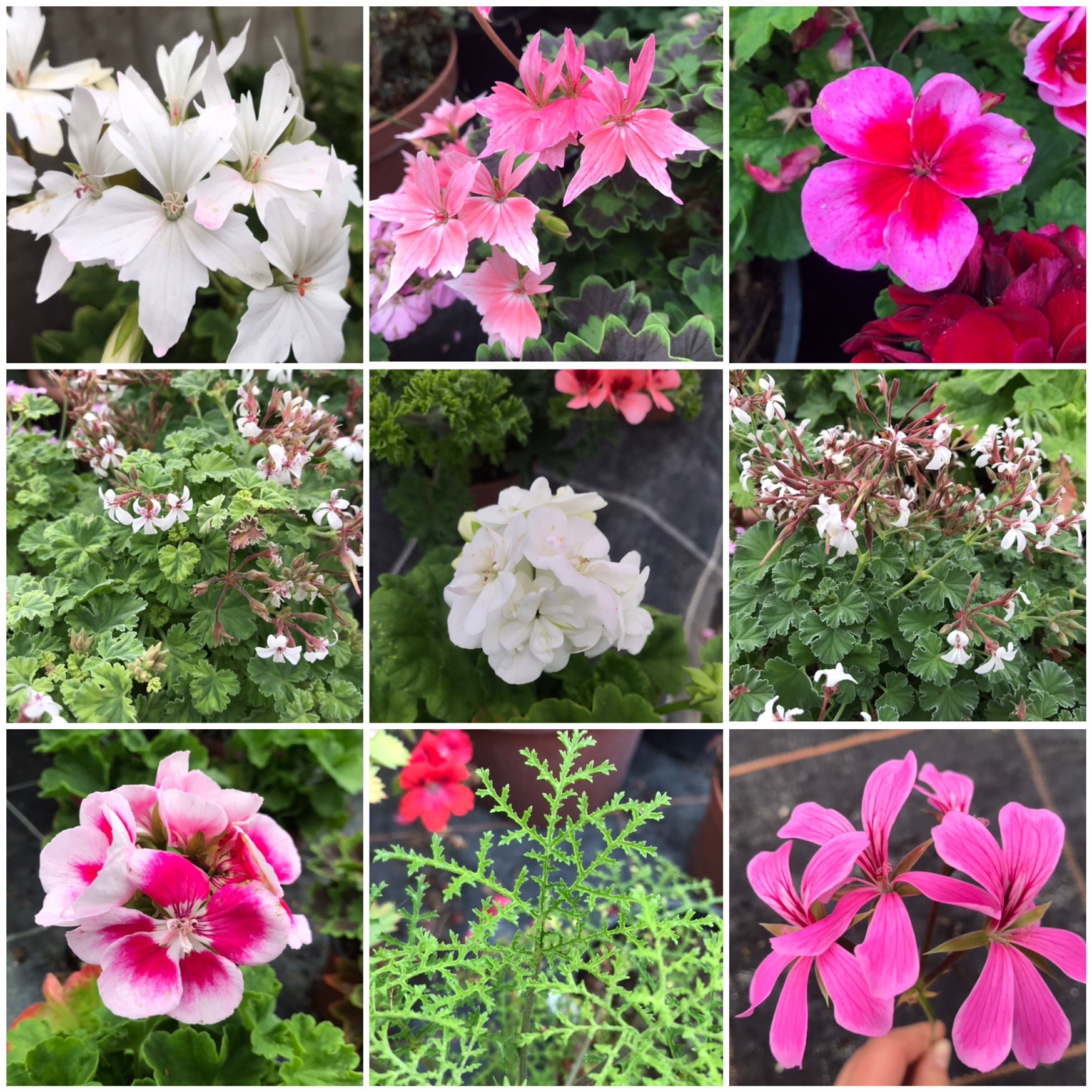 Stellar- Sorten, Edelpelargonien, Duftpelargonien, aufrechte und hängende Sorten, in den Varianten weiss, rosa, lachs, lila, violett, rot, pink, gefüllt, einfach, zweifarbig, duftend, klein und grossblütig und, und, und... Auch die Blätter bieten eine grosse Vielfalt an Farben und Formen.