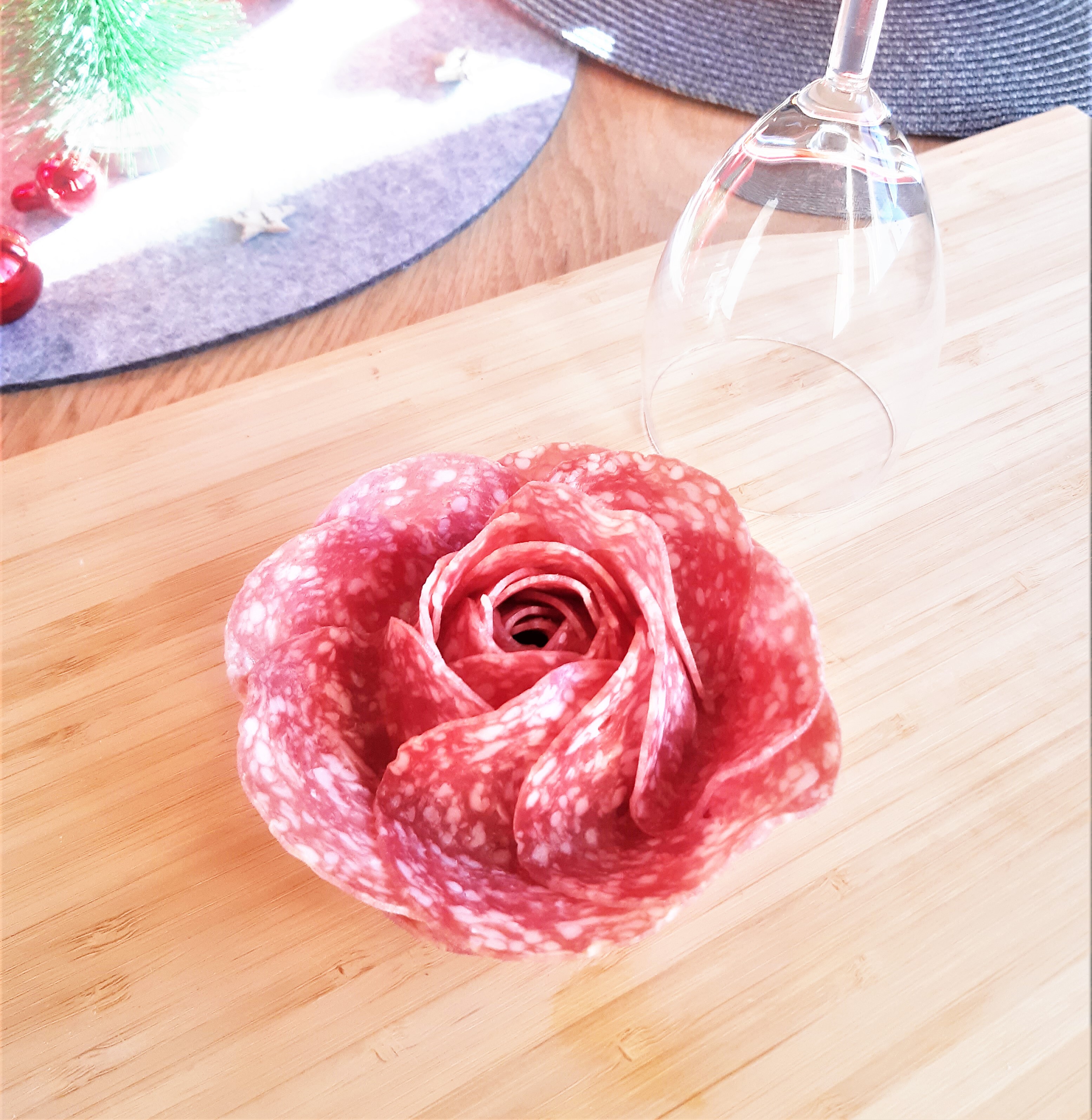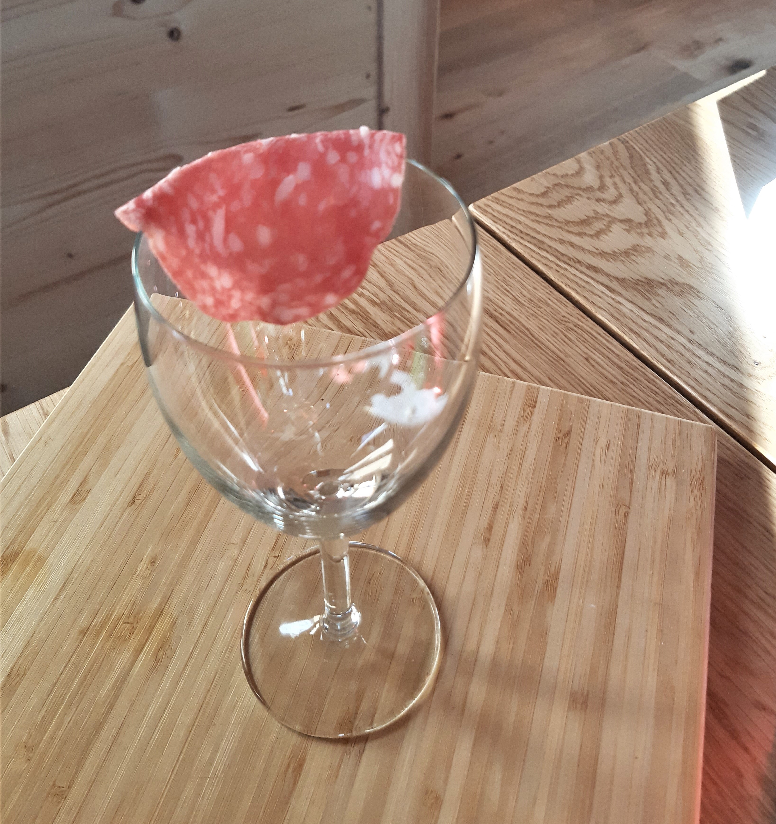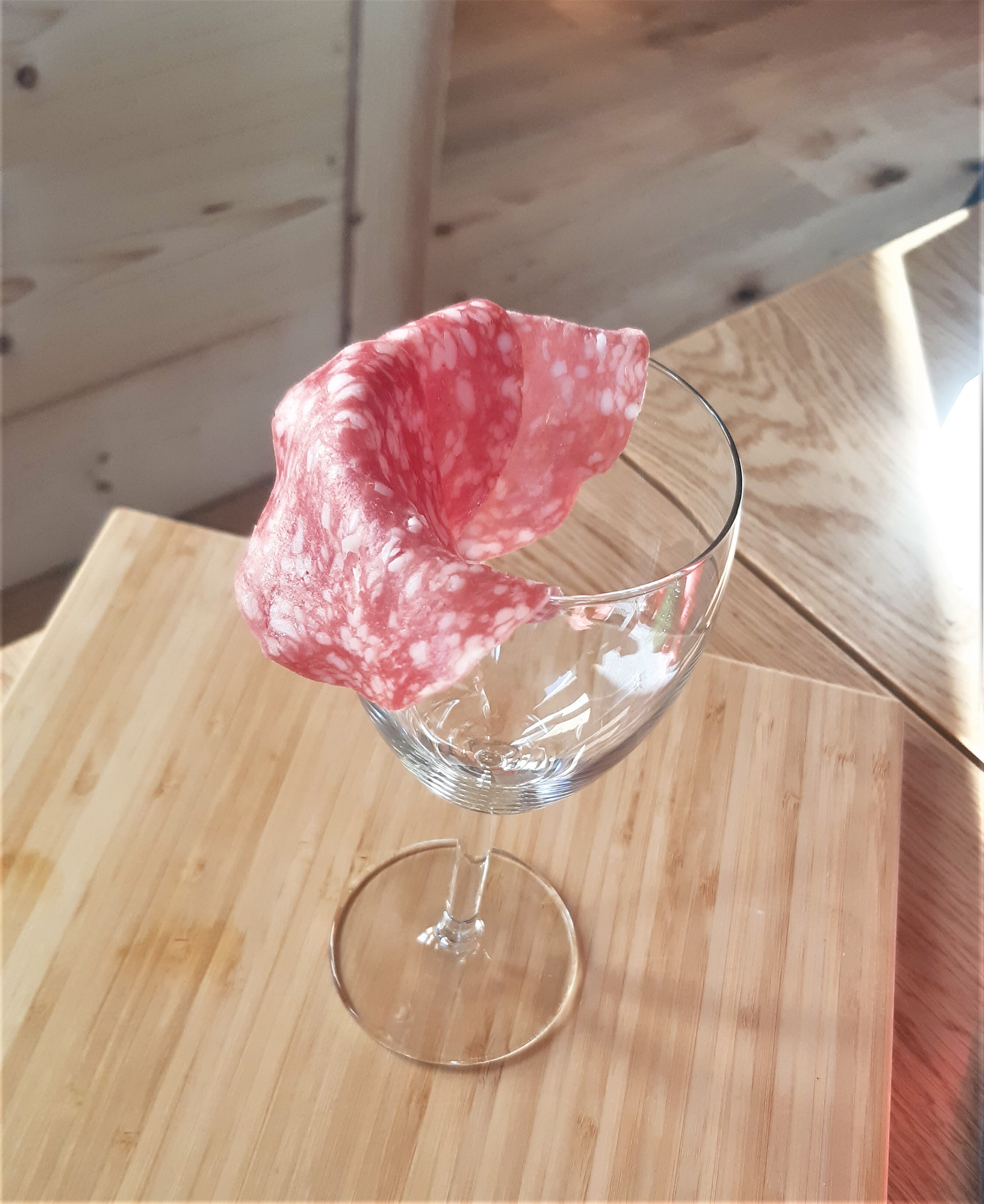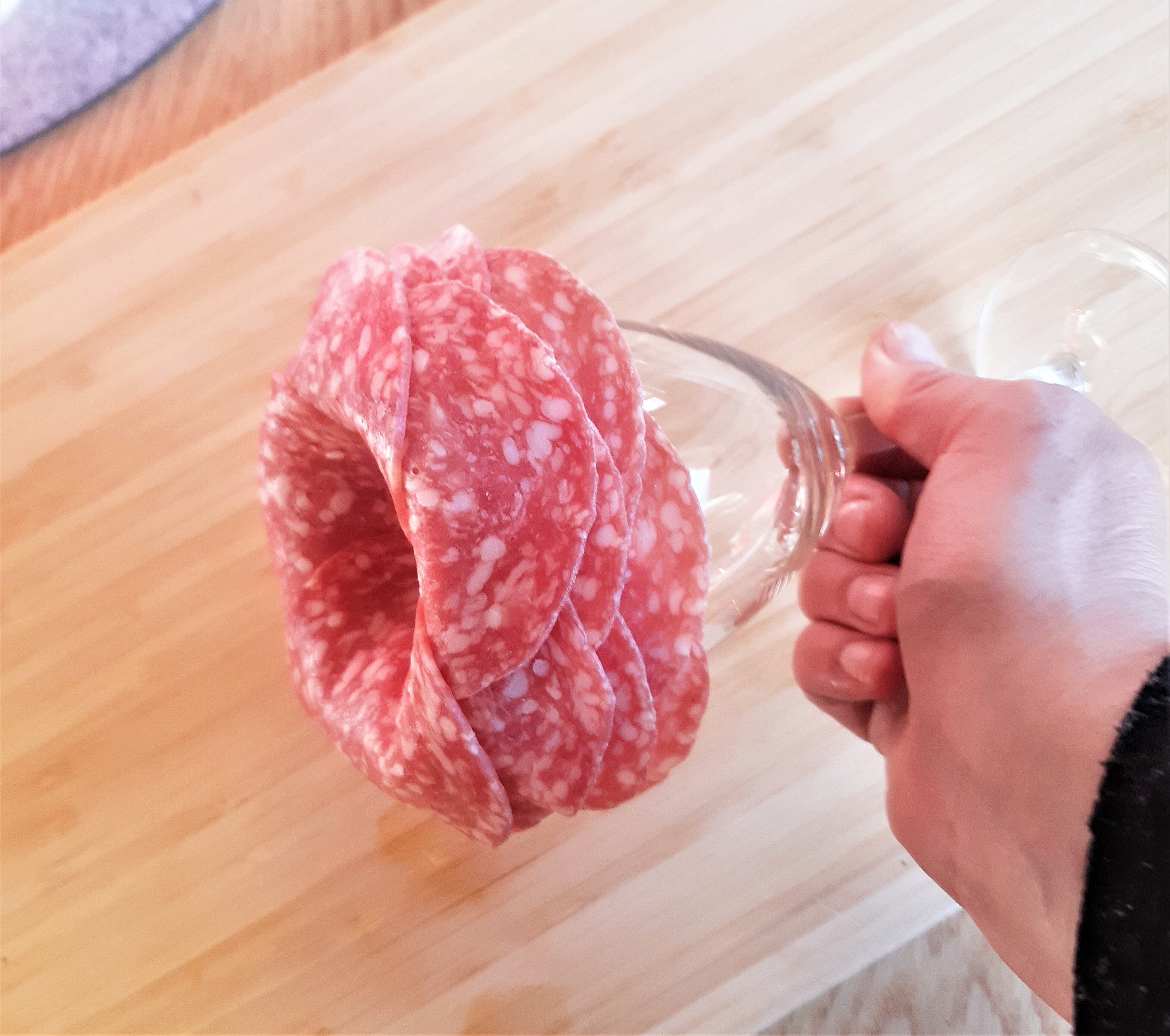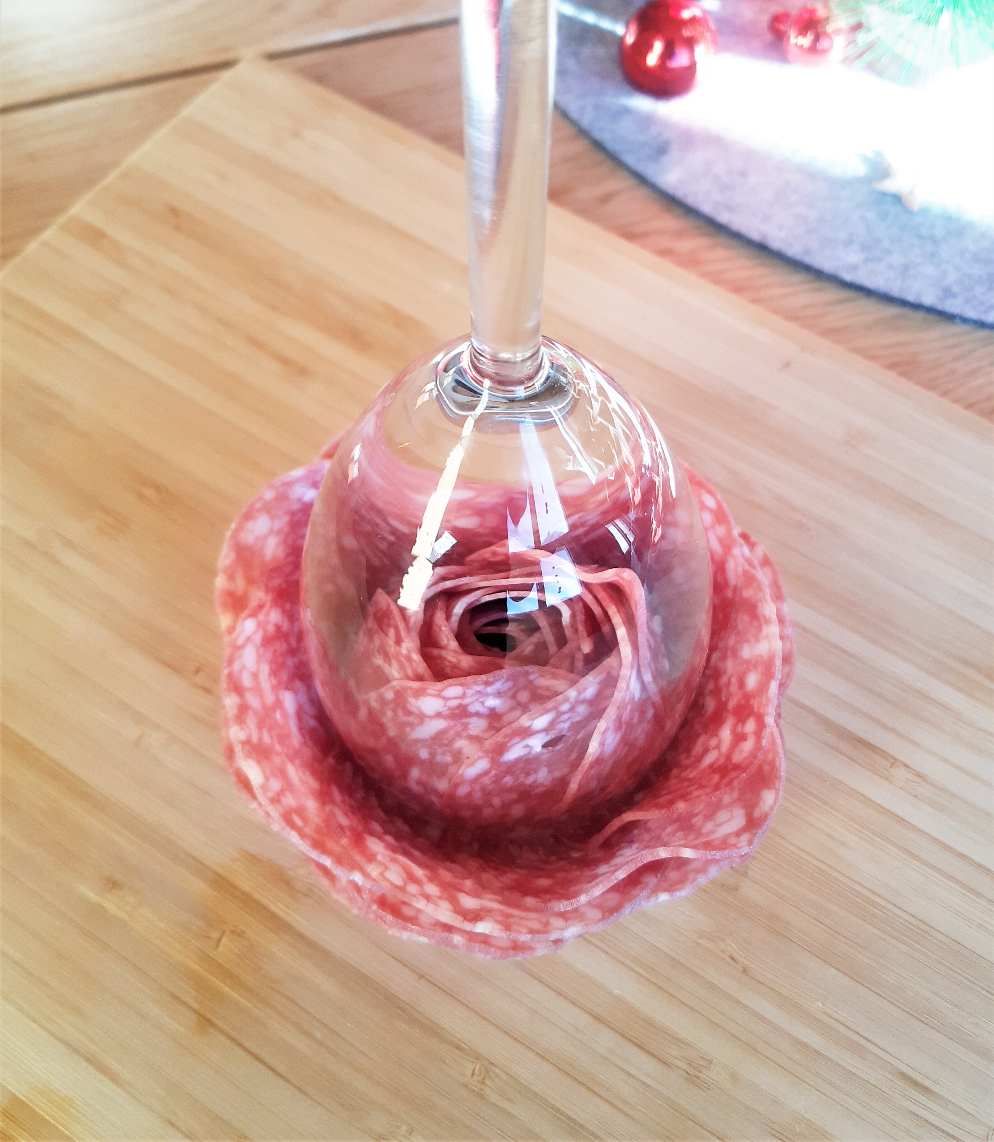 Ein Wein oder Wasserglas mit der Öffnung nach oben platzieren. Die erste Scheibe Salami zur Hälfte über das Glas legen