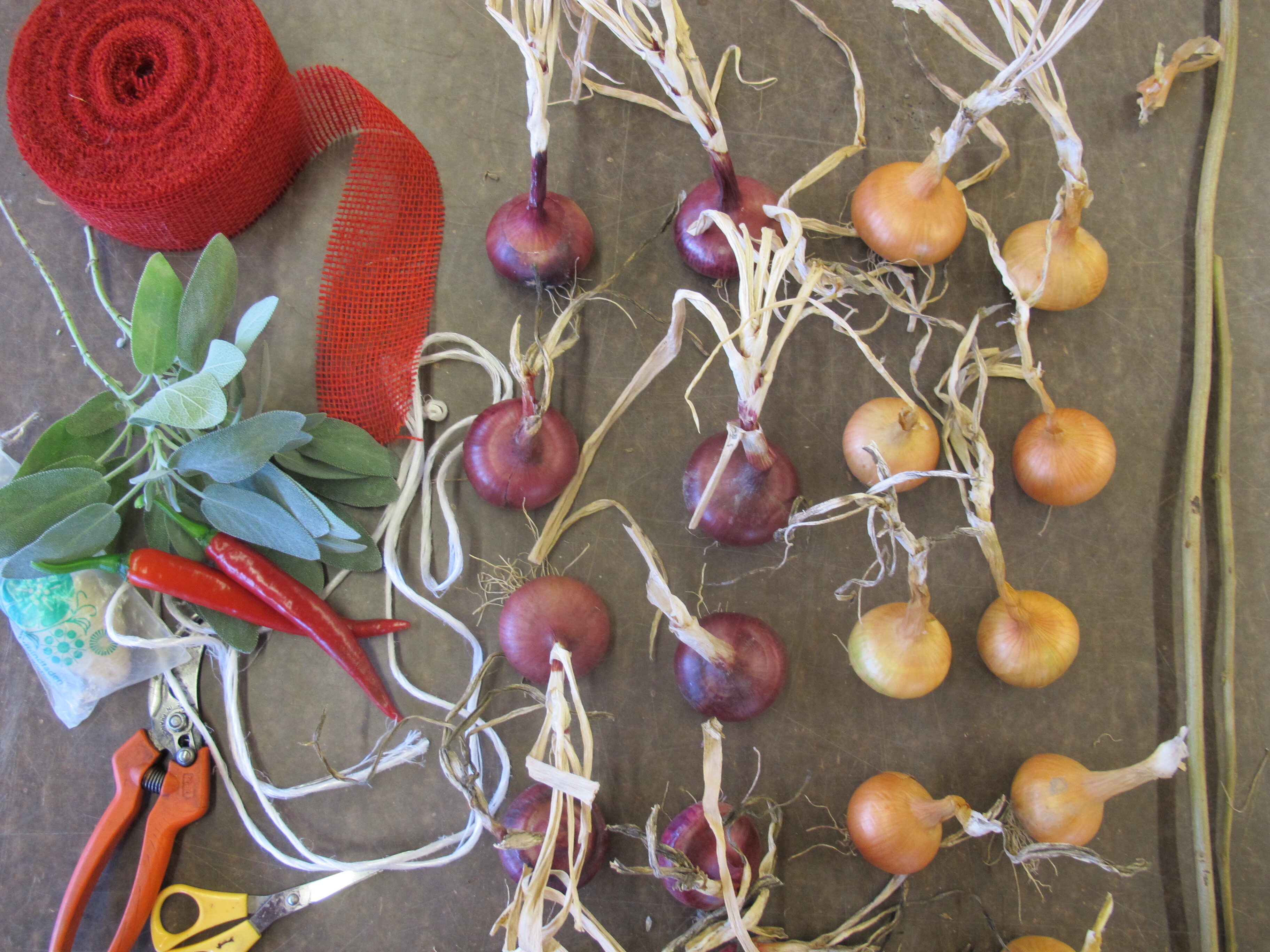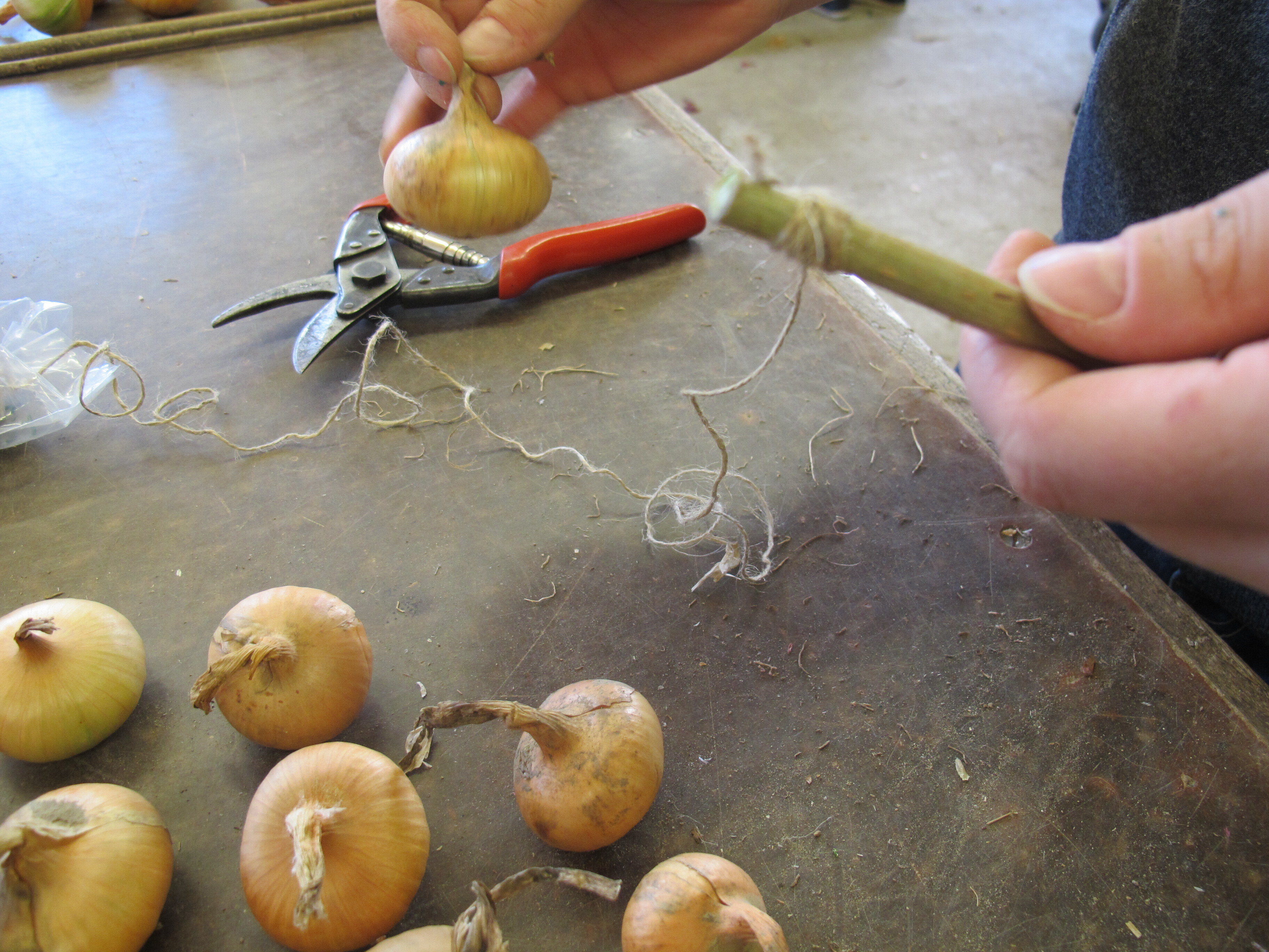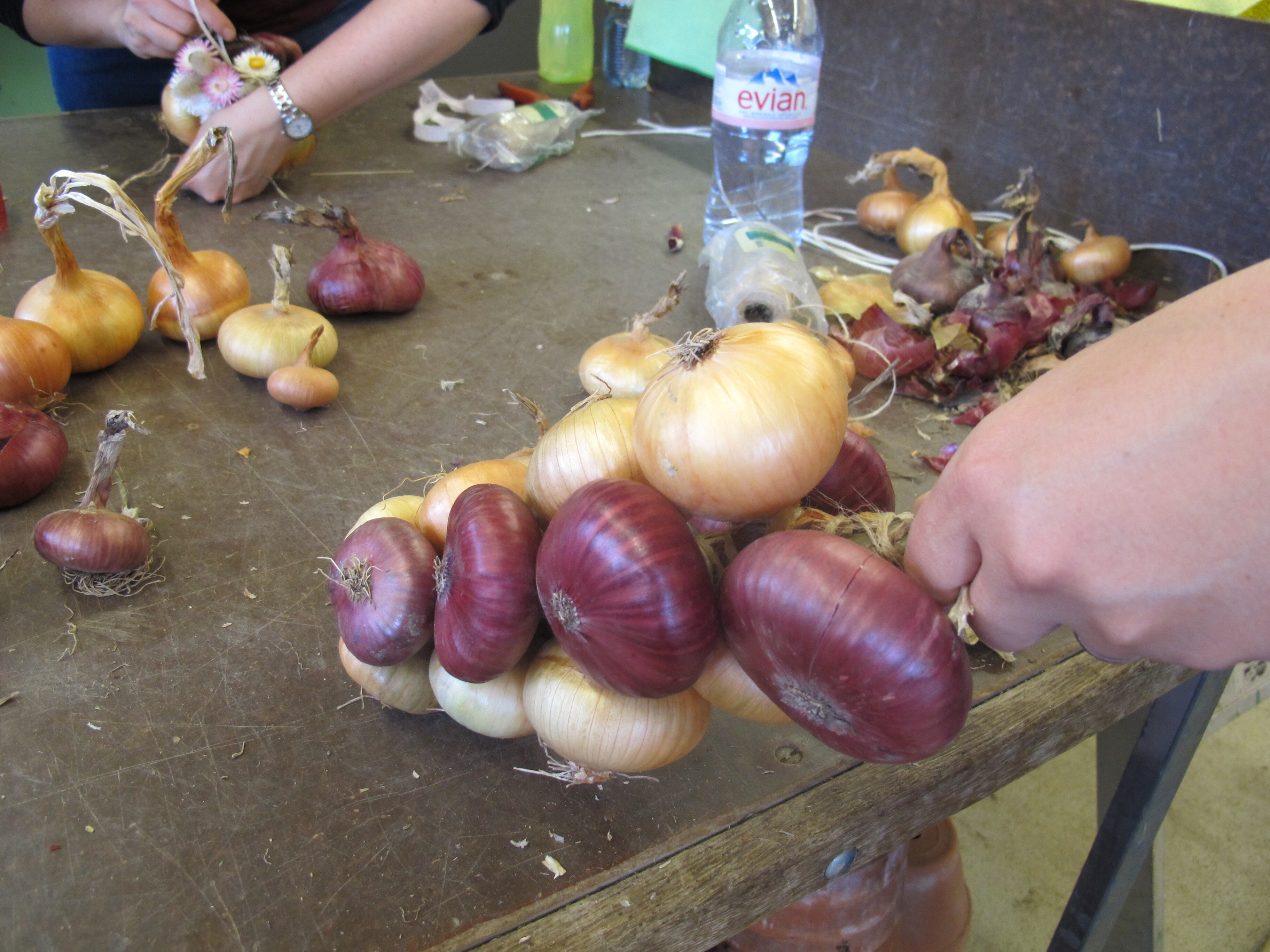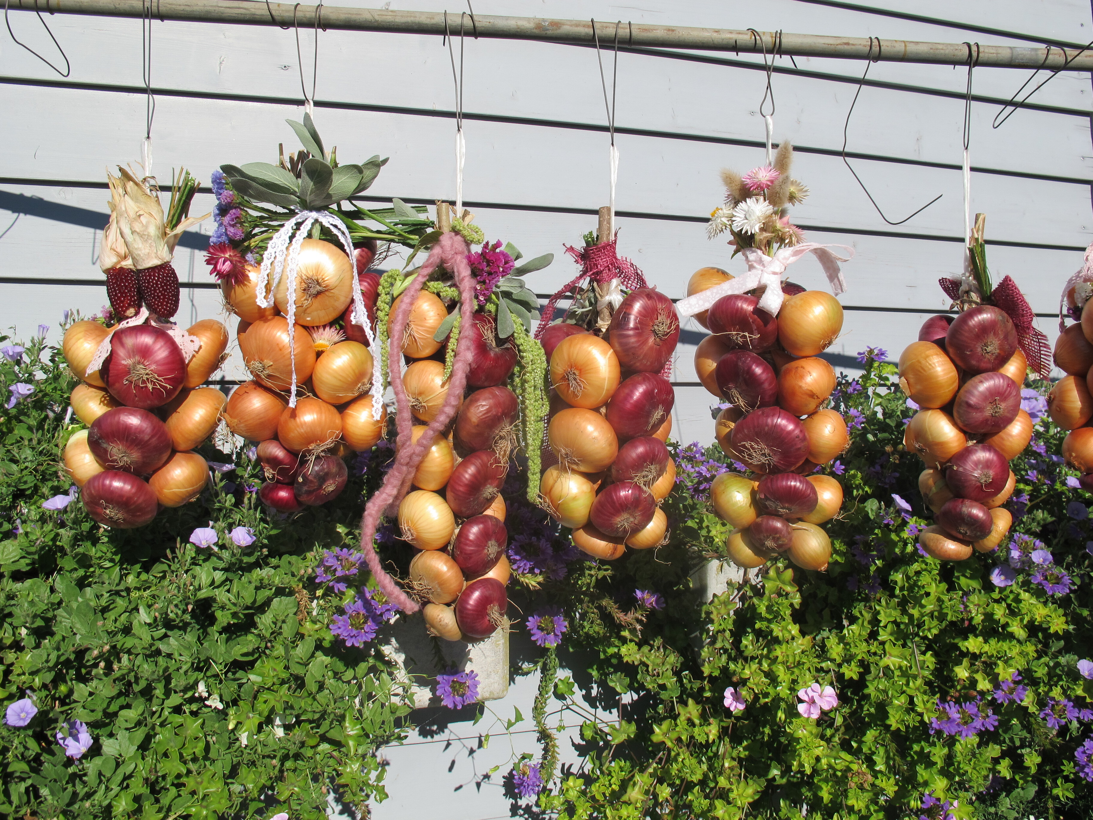 Zwiebeln lagern wir nicht im Keller. Diese können zu Zöpfen geflochten werden und werden danach draussen zum Trocknen aufgehängt.
