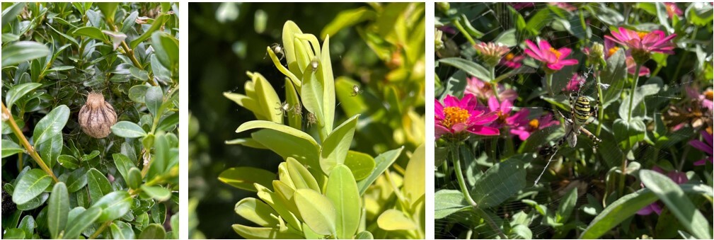 Im Mai-Juni schlüpfen hunderte, winzig kleine Spinnen aus den braunen Kokons, in welchen sie als kleine "Spinnchen" überwintert haben. Recht schnell entwickeln sich daraus die grossen, schön gefärbten Spinnen. Im Juli und August sieht man dann die adulten Tiere in ihren Netzen.