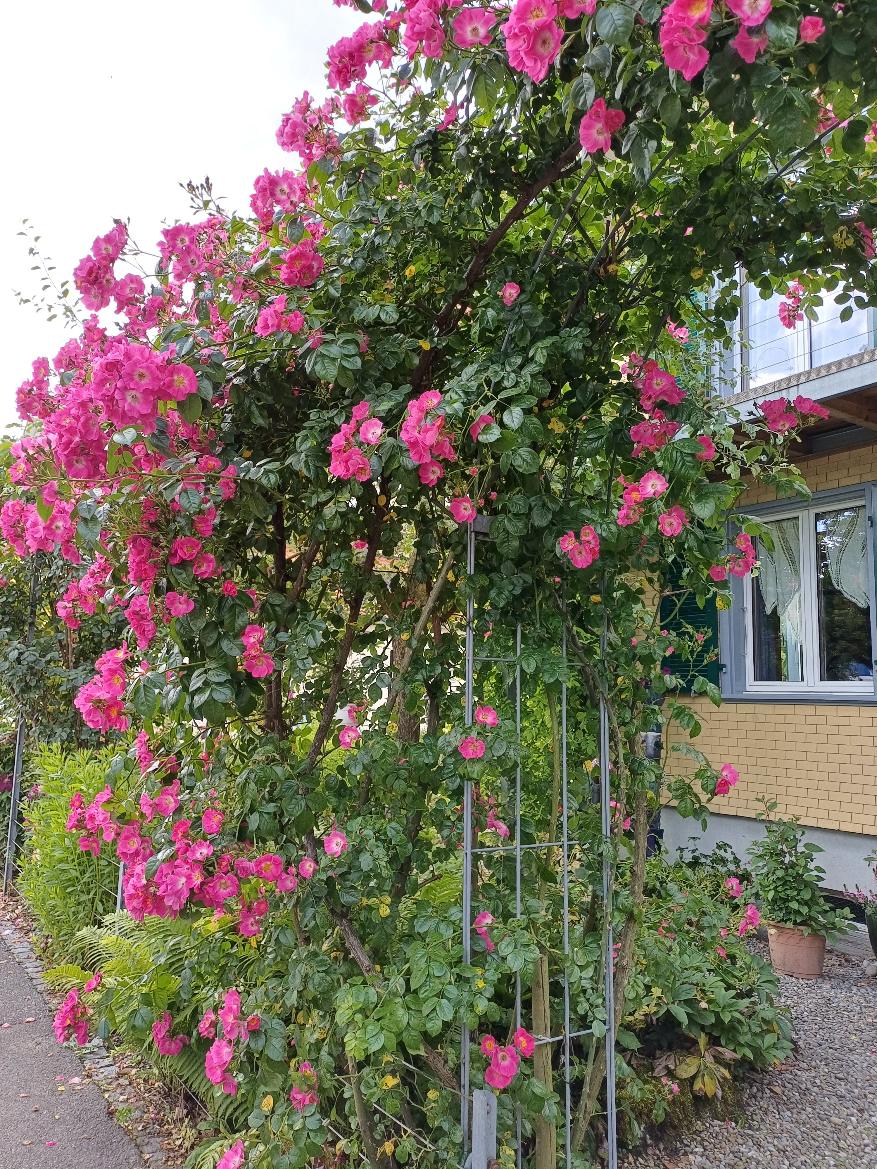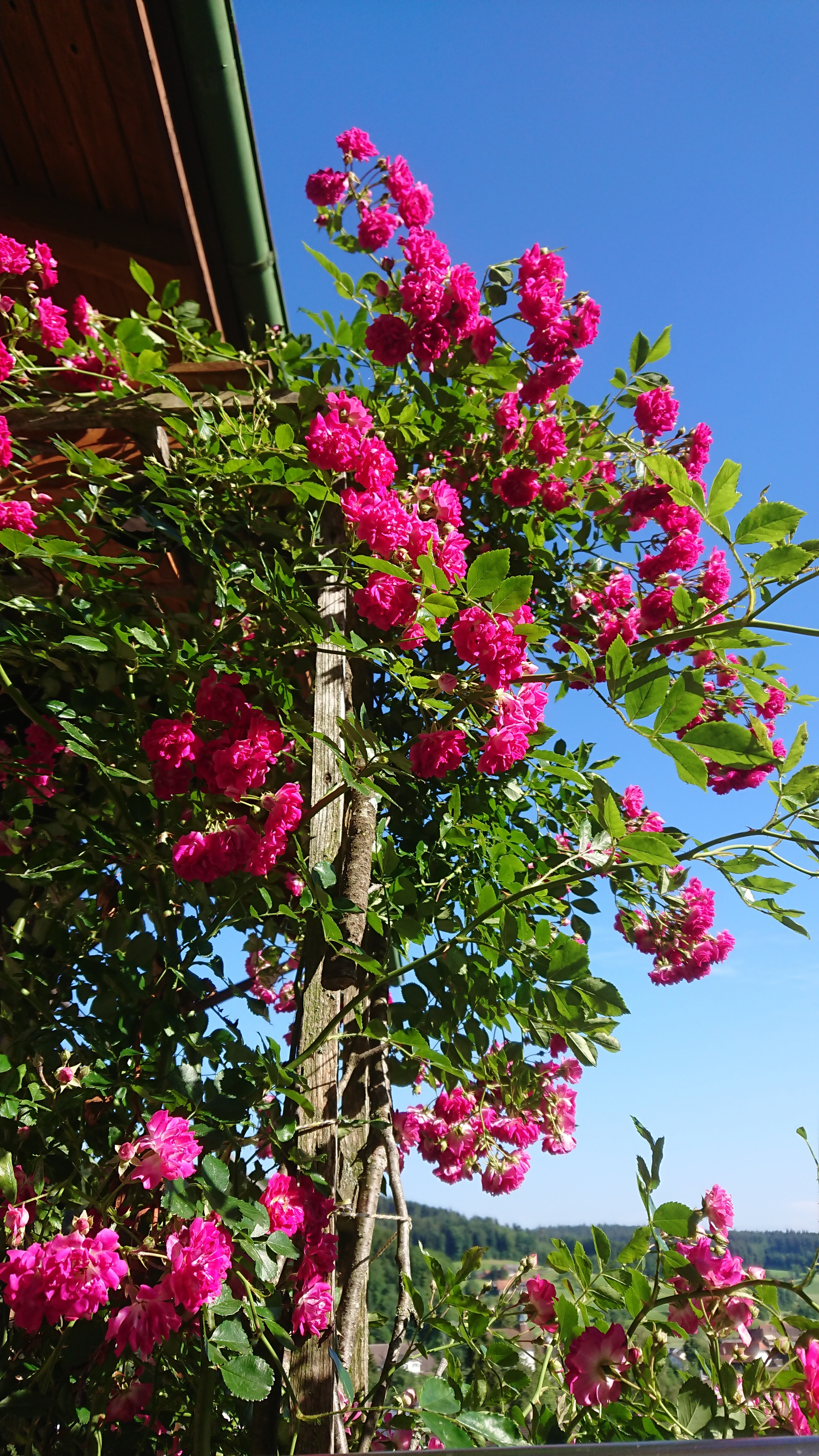 Kletterrosen schneiden wir nicht so stark. Ausser sie wird zu üppig und zu schwer, können wir eine alte Ranke bodeneben ausschneiden und durch einen neuen jungen Trieb ersetzten.