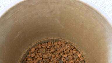 Anschliessend füllen wir etwas Blähton ein. Dieser dient als Wasserabzug. Die Erde sollte nicht vernässen, nicht, dass die Zwiebeln faulen.