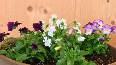 Nun fülle ich die letzte Schicht Erde ein und pflanze noch einige Hornveilchen oder Stiefmütterchen die bereits etwas blühen.